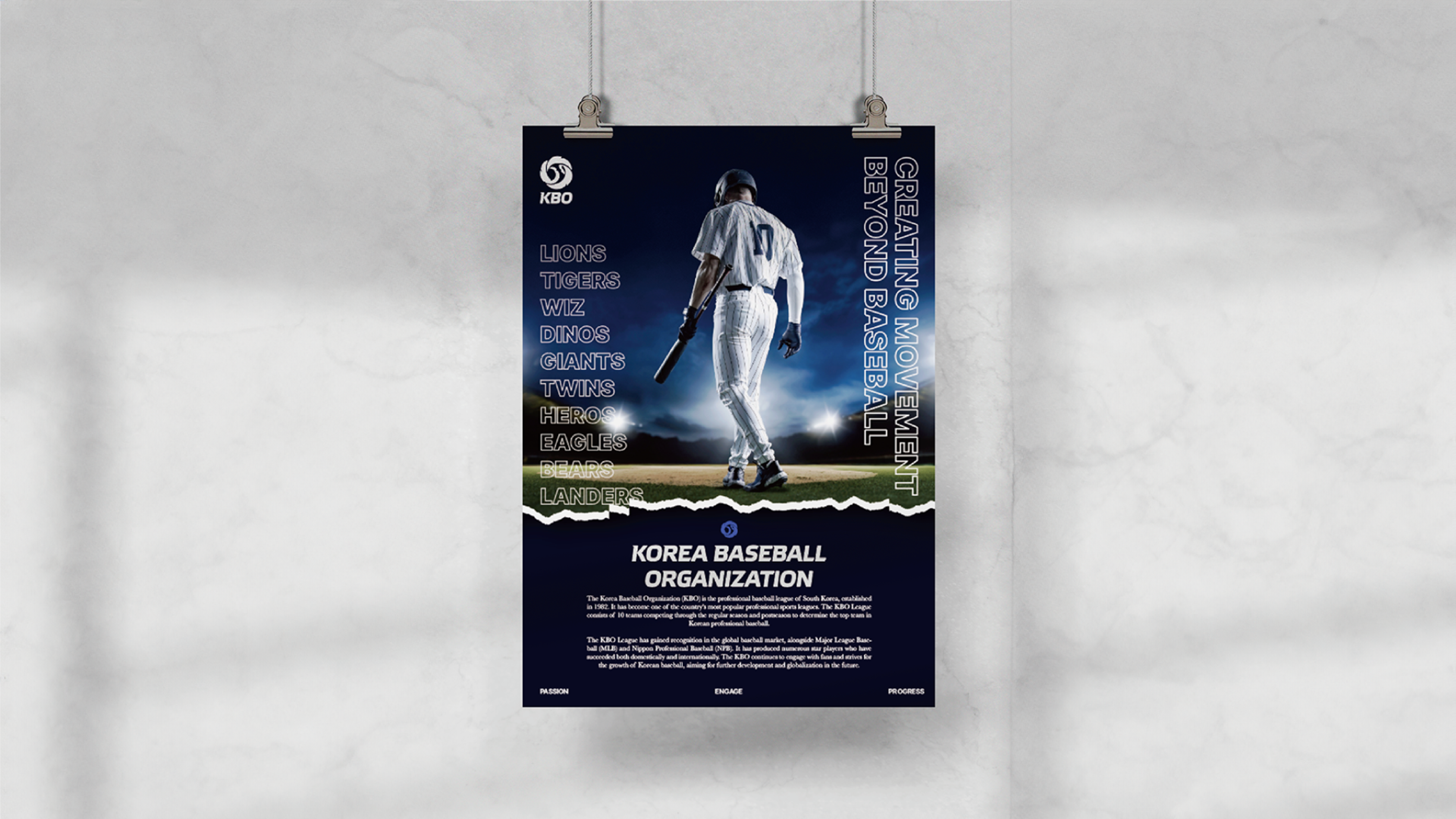 KBO(Korea Baseball Organization)는 한국의 프로 야구 리그로, 1982년에 창설되어 현재까지 한국 최고의 야구 무대를 제공하고 있다. 10개 팀이 정규 시즌과 포스트 시즌을 통해 치열한 경쟁을 펼치며, 매 경기마다 뜨거운 열기와 감동을 선사한다. 이번 포스터와 책은 KBO의 역사와 주요 순간들, 팀별 소개 및 선수 정보, 경기장 분위기 등을 담아 야구 팬뿐만 아니라 KBO에 대한 관심을 높일 수 있도록 제작하였다.