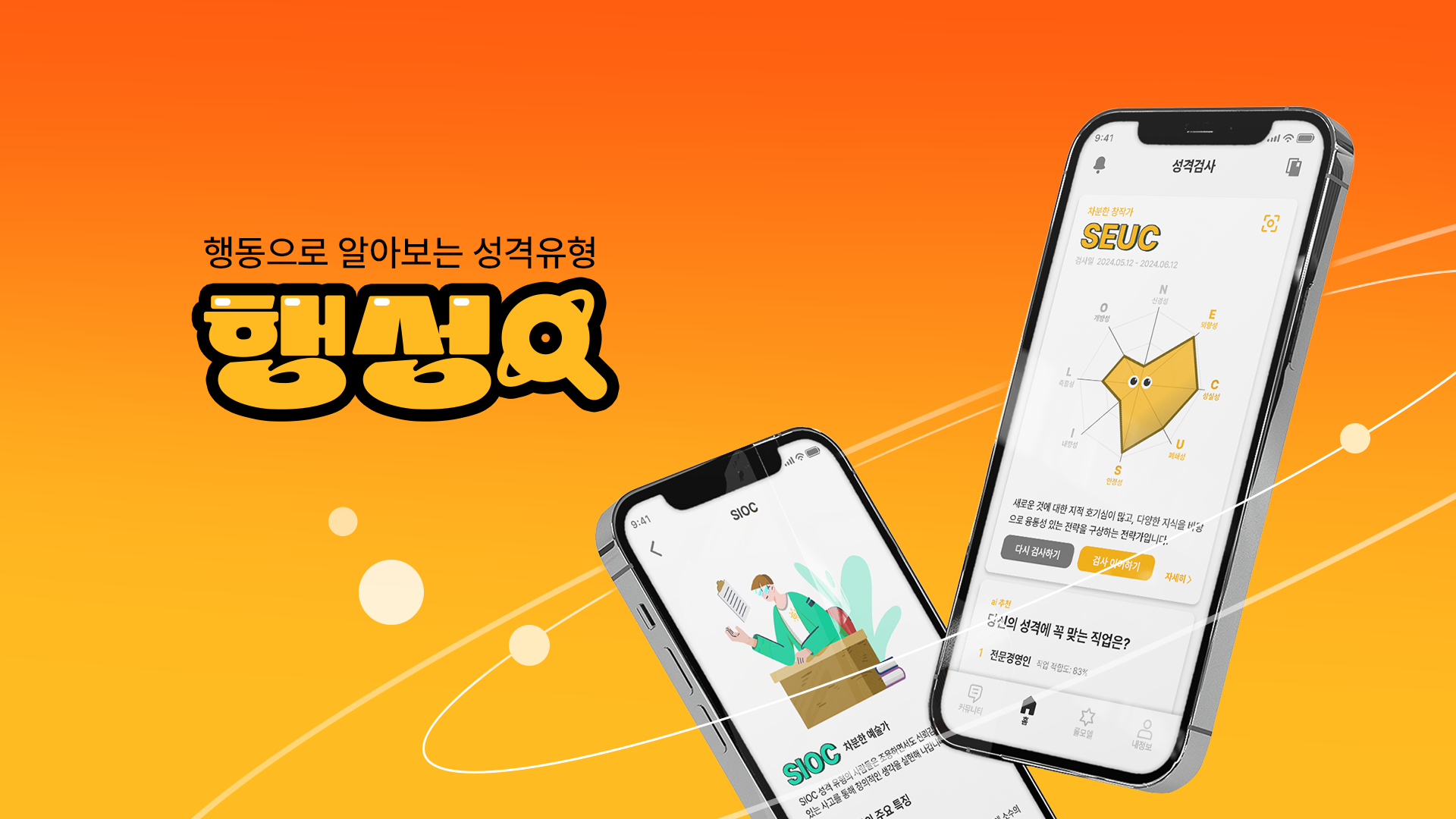 행성'은 사용자의 휴대폰 사용 패턴을 분석하여 성격유형을 알려주는 앱이다. 기존의 성격유형검사는 자기 응답 방식으로 자신이 생각하는 자기 모습에 가깝게 결과가 나타났다면, 새로운 방식의 성격검사는 사용자의 행동 패턴을 직접 분석하여 성격유형을 나타내주므로 이러한 문제를 해결할 수 있다. 성격유형은 BIG5 성격검사에서 실제 휴대폰 사용과 관련 있는 성격 특성을 사용하였다. 이를 재미있게 표현하기 위해 그래프 위에 눈을 달아 사용자마다 다른 그래프를 하나의 생명체처럼 재미있게 풀어보았다. 사용자는 자신의 성격을 확인하고 커뮤니티에서 서로 잘 맞는 성격유형을 찾을 수 있으며, 롤모델 기능을 통해 자신이 닮고 싶은 사람의 행동을 AI에게 추천받아 변화하기 위해 노력하기도 한다.