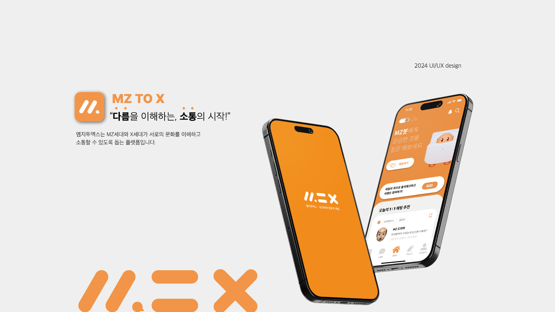 디지털 기술과 소셜 미디어의 발전으로 우리말을 새롭게 창출하고 활용하며 독특한 문화를 형성하는 MZ세대와 빠르게 변해가는 문화에 적응하지 못하는 X세대와의 오해가 쌓여, 세대 간의 갈등이 형성되고 있다. 엠지투엑스는 MZ세대와 X세대를 연결하고 소통을 돕는 모바일 어플리케이션이다. 세대 간의 궁금증을 해소하고, 서로 이해할 수 있는 소통의 창구를 제공하는 것이 주 목적이다. 사용자는 질문과 답변을 통해 서로의 문화를 이해하고, 다양한 주제에 대해 학습할 수 있다. 이 어플 속 AI 채팅 봇이 사용자가 학습 내용을 자연스럽게 익힐 수 있게 도와주며, 이들의 갈등을 해소시켜주는 역할을 한다. 이 어플은 학습과 재미, 그리고 소통을 한곳에 결합하여, 세대 간의 이해와 협력을 돕는 것이 목표이다.