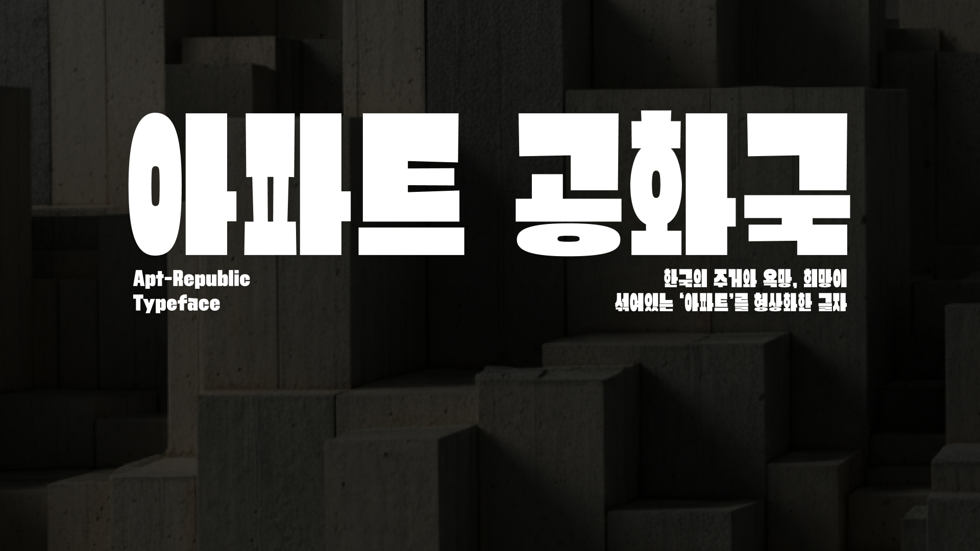 아파트공화국' 서체는 한국의 근현대적 풍경에 대한 깊이 있는 탐구에서 시작된 프로젝트이다. 이 서체는 대한민국의 주거 문화와 국민들의 욕망과 희망이 공존하는 공간인 '아파트'를 통해 한국의 근·현대 사회와 문화의 중요한 특징과 인상을 고스란히 반영하고 있다. 수직으로 뻗은 자소와 굵은 세로획은 아파트의 높고 가늘게 솟은 시각적인 모습을 연상케 한다. 또한, 오밀조밀한 속공간은 아파트의 내부 공간, 즉 밀도 높은 생활 공간을 상징한다. 이러한 특성을 글자로 풀어낸 '아파트공화국' 서체는 대한민국의 주거 문화와 사회적 현상에 대해 고찰할 수 있는 하나의 매개체로 활용될 수 있음을 시사한다.