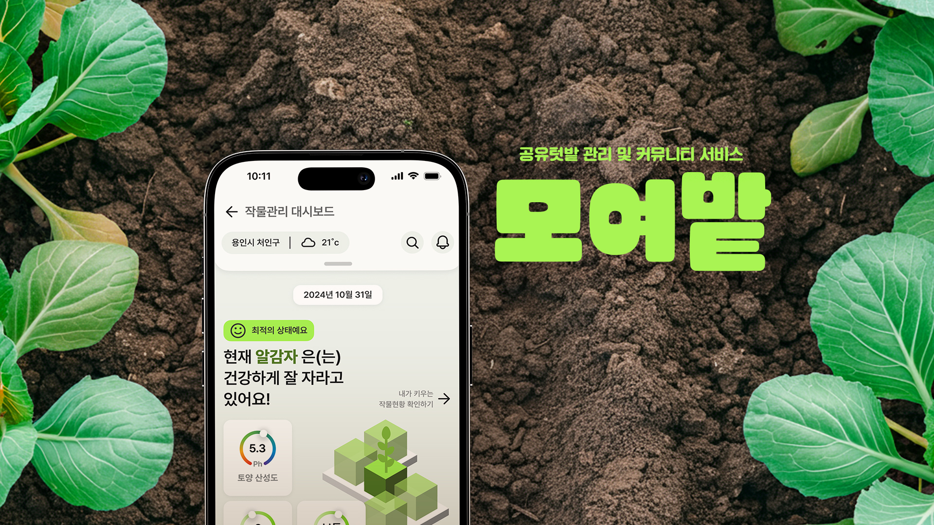 도시화에 따른 환경 보호에 대한 관심이 높아짐에 따라 도시 공유텃밭의 수요와 관심도가 증가하고 있다. 그러나 공유텃밭을 찾고 이용하며 관리하는 과정은 여전히 번거롭고 어려운 경우가 많다. 또한, 기존의 다양한 서비스들이 통합되지 않아 사용자들이 편리하게 활용할 수 있는 플랫폼이 부족한 실정이다. '모여밭'은 이러한 산발적인 정보와 서비스를 하나로 통합하여, 도시 공유텃밭 이용자와 관리자(텃밭 운영자)가 쉽게 사용할 수 있는 서비스를 제공한다. 이를 통해 도심 속 공유텃밭이 시민 누구나 텃밭 문화를 즐길 수 있는 공유공간으로 확장되는 데에 있어서 징검다리 역할을 하는 서비스이다.