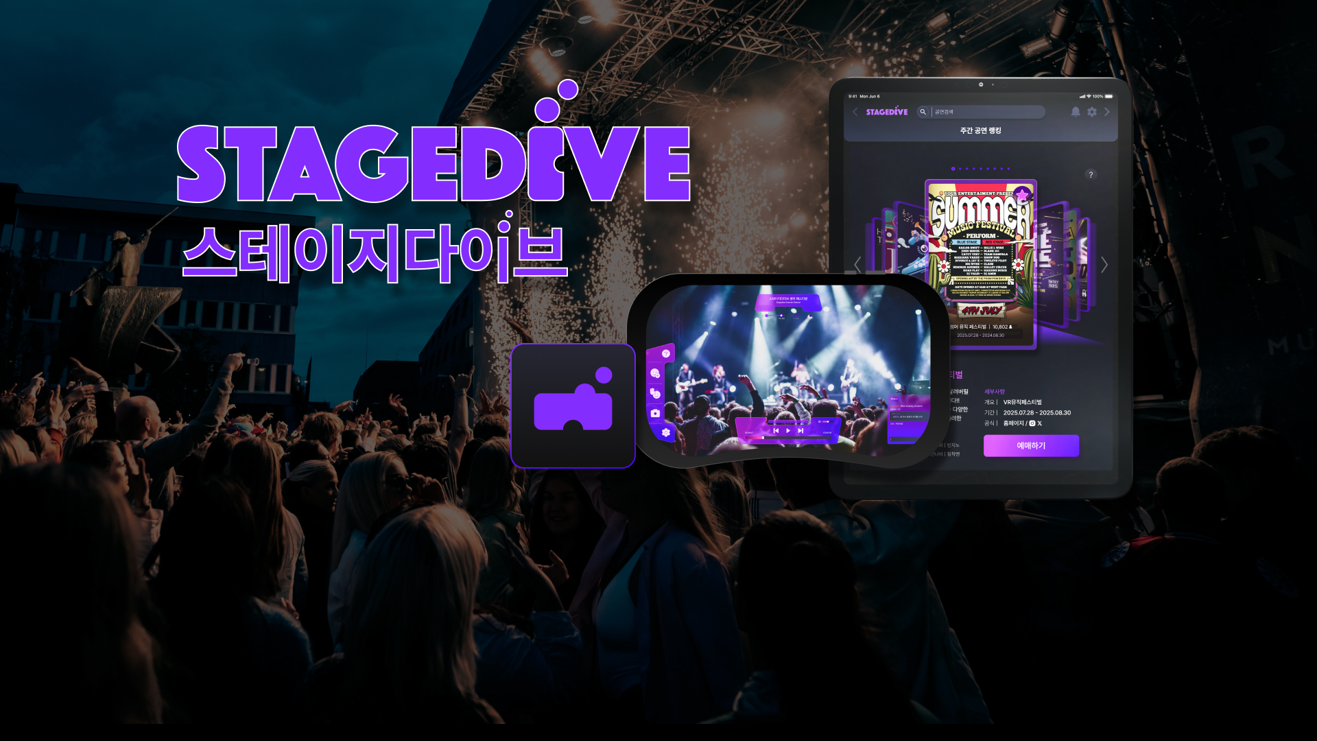 스테이지다이브(STAGEDIVE)는 뜨거운 공연현장을 VR 기술을 이용해 바닷속에 뛰어들듯이 공연을 생생하게 체험할 수 있는 앱이다. 스테이지다이브는 점점 발전하는 VR 기기의 기술에 맞춰 기존의 여러 플랫폼에 흩어져있는 VR 콘텐츠를 더욱 편하게 하나의 플랫폼으로 확인하고 예약하고 시청할 수 있도록 한다. 스마트폰 앱과 VR 기기의 연동으로의 시공간의 제약을 벗어나 언제든지 공연을 시청 가능하며 티켓을 예약할 시에 VR 기기를 대여하거나 굿즈를 구매할 수 있다. 또한 오프라인 환경에서 관객들의 상호작용이 가능한 것처럼 스테이지 다이브에서는 공연을 시청하는 이용자들 간에 채팅 기능과 이펙트 응원 기능을 이용해 함께 즐길 수 있다.