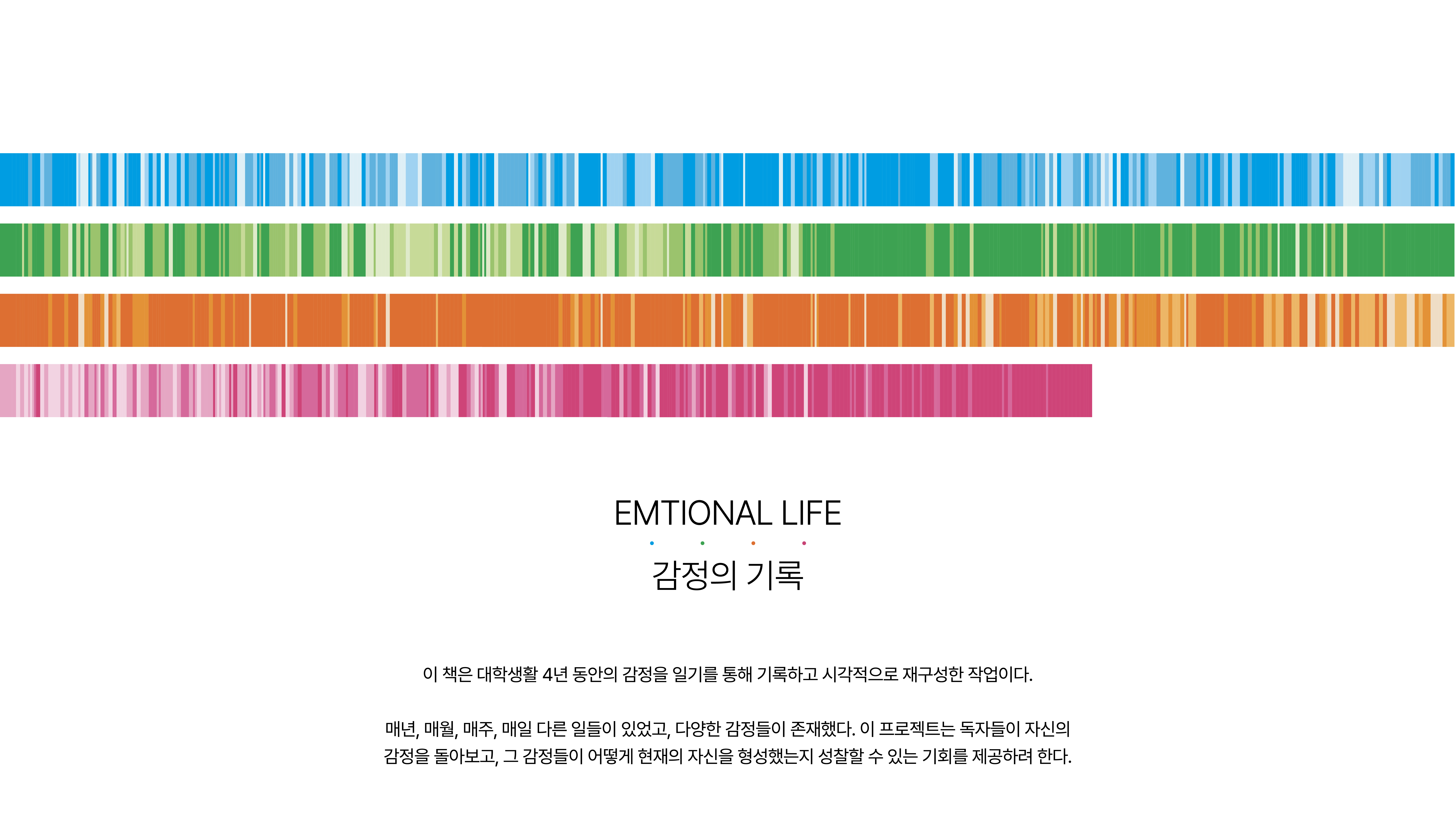 이 프로젝트는 지난 4년간의 일기를 희(기쁨), 노(분노), 애(슬픔), 락(즐거움)으로 분류하고, 각 감정을 색상으로 표현하여 시각화한 작업이다. 매일의 감정 상태를 기록한 데이터를 바탕으로, 한 해 동안 느낀 감정의 분포를 시각적으로 나타냈다. 365개의 칸에 각 날의 주된 감정을 색으로 칠해 감정의 흐름을 보여주고, 이를 투명한 포스터 4장에 담아 겹쳐서 감정의 변화를 한눈에 볼 수 있게 구성했다. 이와 함께 책에서는 매년의 감정 변화와 그 속에 담긴 이야기를 더욱 깊이 있게 다루고 있다.
