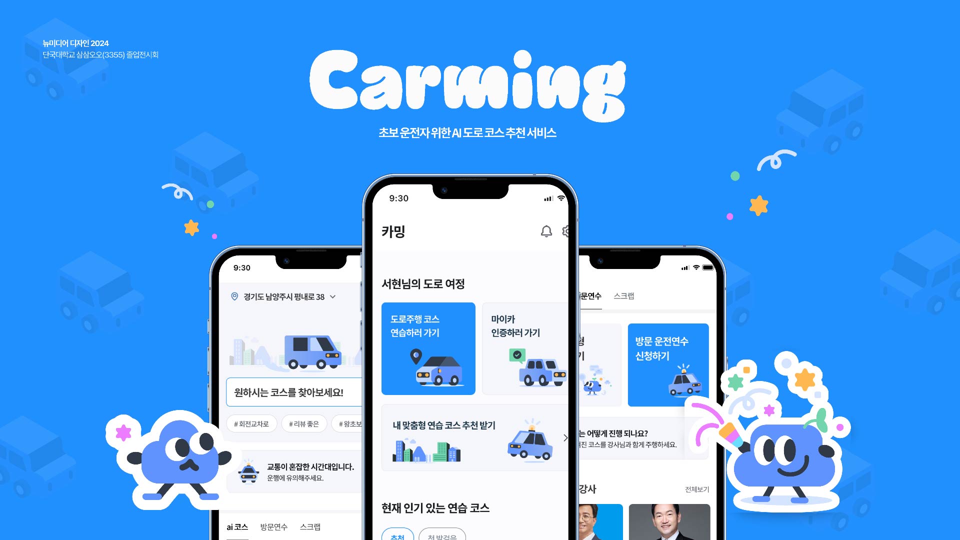 "카밍(Carming)"은 초보 운전자를 위한 AI 기반 도로주행 학습 플랫폼이다. 이 서비스는 초보 운전자들이 운전 중 직면하는 두려움과 불안을 줄이고, 안전하게 운전 기술을 익히도록 기획되었다. 카밍은 사용자의 운전 실력을 분석하여 맞춤형 연습 코스를 추천하며, 자동차 블루투스와 모바일 디바이스를 연동해 주행 중 실시간 안전 경고 및 피드백을 제공한다. 또한, 주행 기록을 바탕으로 오답노트를 통해 피드백을 받고 자신의 약점을 파악하여 보완할 수 있다. 기본적인 주행 연습은 AI를 통해 저렴하게 진행하며, 고난이도 기술이나 돌발 상황 대처는 방문 강사를 통해 학습할 수 있는 혼합 학습 방식을 도입하여 도로연수 비용 부담을 줄이는 서비스이다.