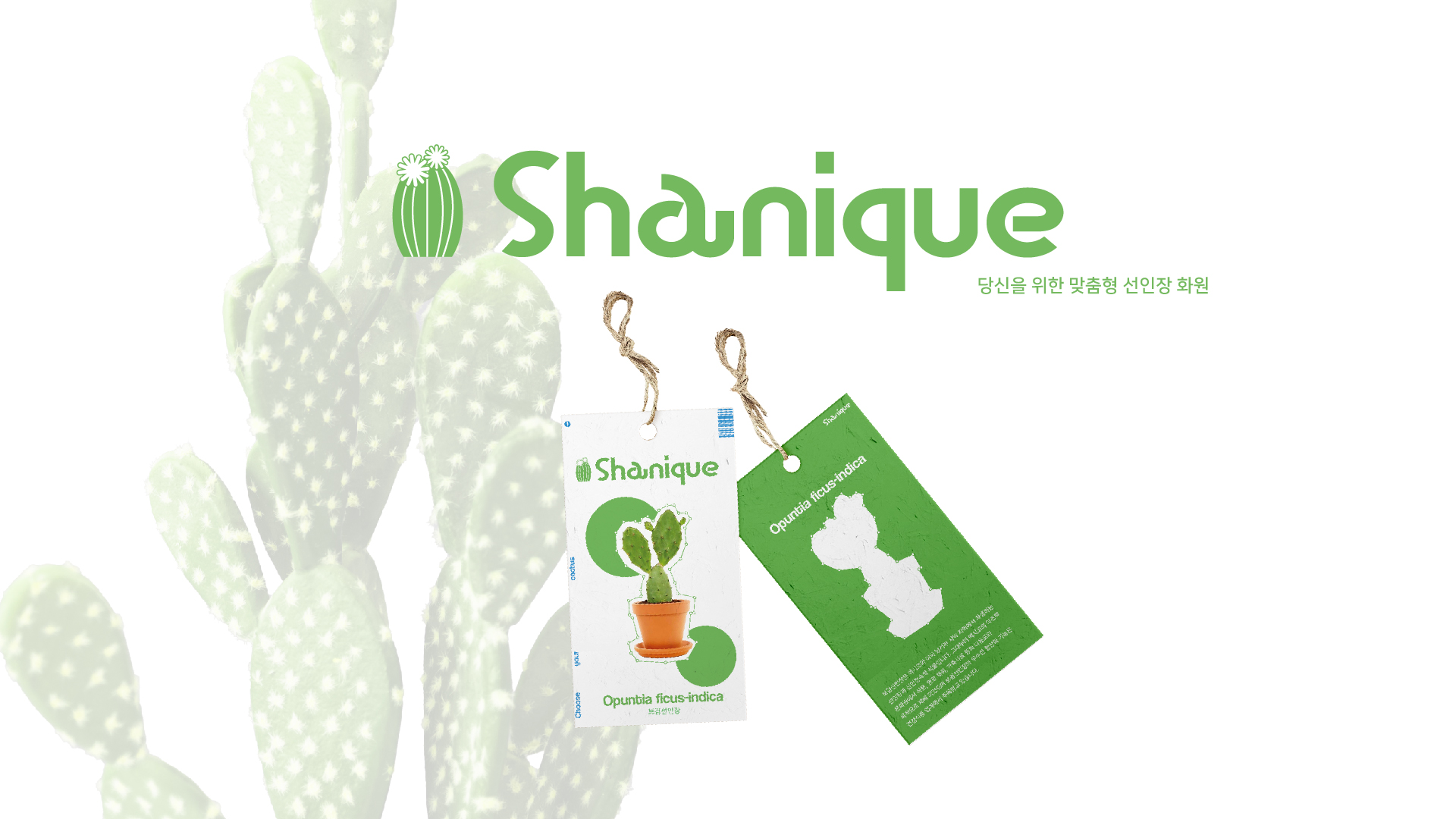Shanique는 선인장 전문 화원 브랜드이다. 선인장은 위험하고 까다로운 식물이라는 편견을 극복하고 반려 식물로의 적합성을 강조하기 위해 브랜딩 되었다. 샤니크는 소비자들의 취향과 상황을 고려한 선인장을 맞춤 추천해 주며 그에 맞는 선인장 재배 방법을 알려준다. 브랜드 네임은 영단어 sharp(날카로움)+unique(유일한, 고유한, 독특한)의 조합으로 만들어졌으며 선인장의 날카로운 가시가 사람들에게 위험한 요소로 여겨지는 것보다 선인장만이 가지고 있는 유일하고 고유한 특징임을 알리기 위해 지어진 네임이다.