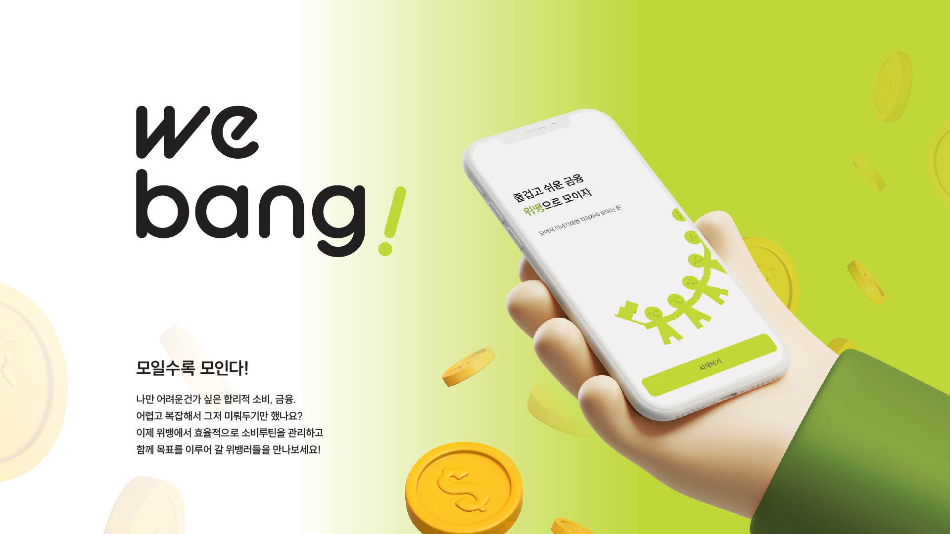 20대는 전 연령 중 금융이해력 점수가 65.8점으로 가장 낮다. 자신의 경제 수준에 대한 불안감 또한 63%로, 저축, 소비, 경제 등 금융에 대한 인식 변화가 절실히 필요한 세대이다. 위뱅은 오늘날의 20대를 위해 만들어진, 소비 습관을 바로 잡고 금융에 대한 이해도를 높일 수 있는 앱이다. 사용자의 소비패턴을 파악하여 달마다 소비 리포트를 제공하고, 맞춤 금융상품, 관심 브랜드의 할인 정보를 추천해 체계적으로 소비를 관리할 수 있다. 한 달간 정해진 예산으로 생활하는 한 달 목표 서비스로 효율적인 소비를 돕고 위뱅파티에 참여해, 사람들과 함께 목표를 이뤄 나갈 수 있다. 또한, 금융 퀴즈, 토론을 통해 관련 지식을 얻어갈 수 있다.
