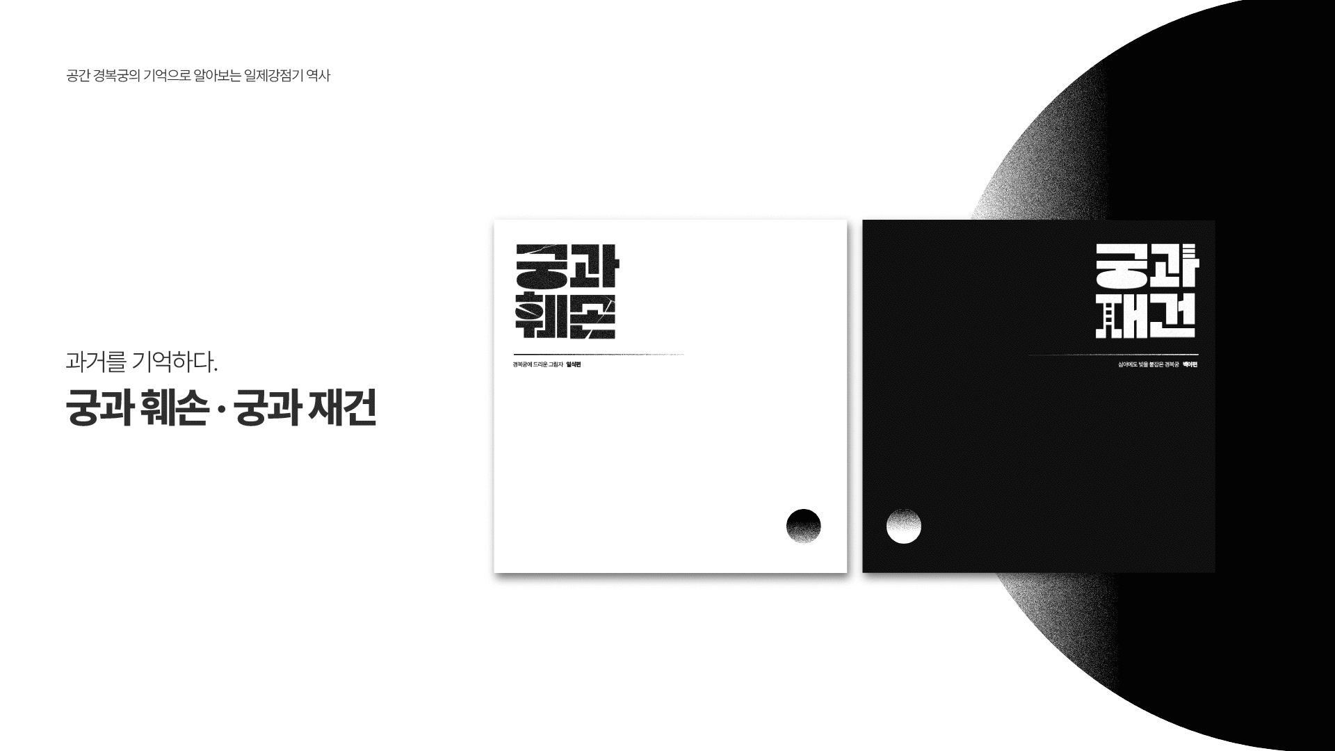 1945년 8월 15일, 조선은 독립을 꿈에 그리던 독립을 맞이했다. 약 35년간 이어진 아픔은 멈췄으나 그 흔적이 완전히 지워진 것은 아니다. 일제강점기를 기준으로 경복궁은 일제에 의해 건물이 훼손당하거나 용도가 변하는 일을 거쳤다. 경복궁이 타인의 악의에 의해 그런 식으로 공간이 크게 훼손되고 변형되는 일은 유례가 없었다. 궁과 훼손(일식편)은 일제강점기 이전의 경복궁을, 궁과 재건(백야편)은 일제강점기 당시와 그 이후의 경복궁을 설명하고 있는 쌍둥이 책이다. 사용자는 스티커를 활용해 책을 훼손하고 재건하는 방식을 통해 책이 숨기고 있는 이야기, 즉 AR에 접근할 수 있다. 기억해야만 하는 과거를 우리는 경복궁이라는 공간의 기억을 통해 학습한다.